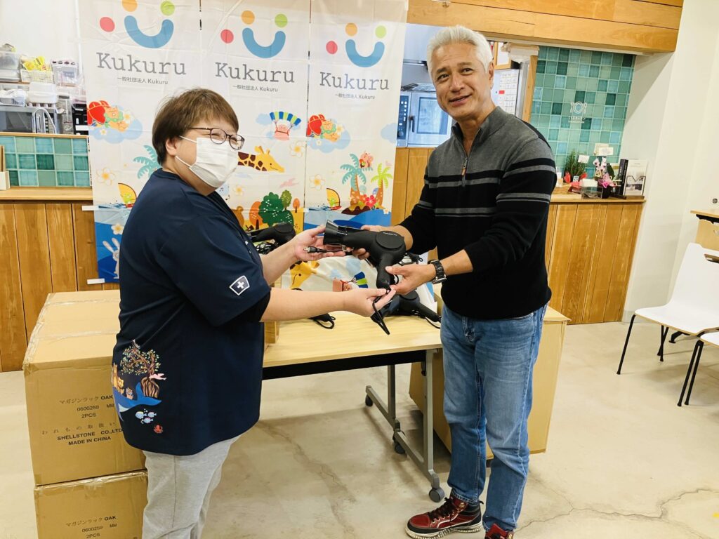 ハレクラニ沖縄様から頂戴したドライヤーとブックスタンドは、いずれもホテル内の備品の入れ替えによって発生したもので、まだ十分使用できるものであることから、当法人にお声かけいただきました。寄贈品は、医療的ケア児を支援する団体や病院等へ分配する予定で、贈呈式にはKukuruのご近所、ファミリーハウスがじゅまるの家のスタッフさんも駆けつけてくださいました。